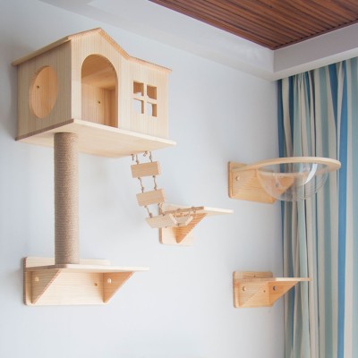 Wall-mounted Cat Tree House Solid Wood Scraching Post for Cat Jumping Platform Springboard Cat Furniture