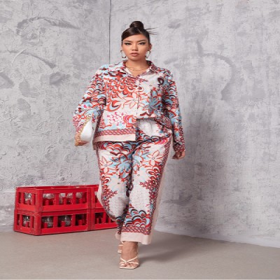Plus Size Women Two Pieces Set Tracksuit Office Clothes Autumn Trend Casual Leaf Floral Print Blouse & Wide Leg Pants Set