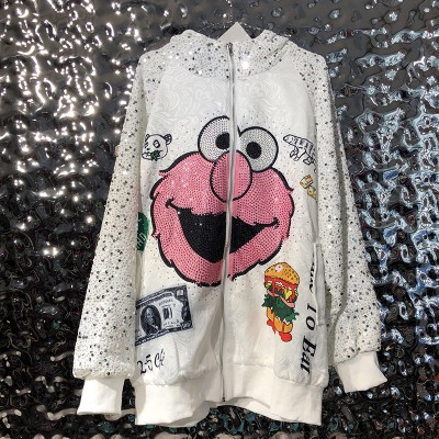 Spring Women Long Sequins Cartoon Print Loose Casual Baseball Coat Oversize Hood