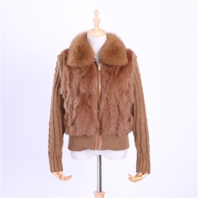 Women's Genuine Real Rabbit Fur Fox Fur Collar Knitting Sleeve Women's Winter Coat Fur Jacket Casual Short Outwear Slim