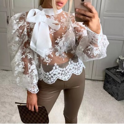 40# Women Blouse Hollow Out Long Sleeve Turtleneck Mesh Lace Bow Sexy Blouse Drawstring Ruched Sweater Tops Блузка С Кружевом