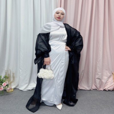Eid Djellaba Women Abaya Dubai Soft Solid Puff Sleeves Muslim Dress Silky Kaftan Dubai Turkey Muslim Robe Islamic Abaya Cardigan