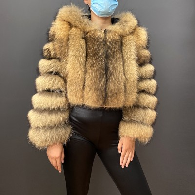Winter Hood Real Fur Coat Women's Top Raccoon Fur Coats Detachable hood Tall Waist Style Short Coats