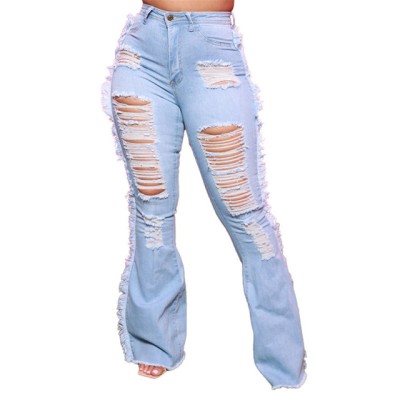 HAOOHU Street Wear Urban Plus Size Women Jeans High Waist Hole Tassel Wash Water Vintage Casual Flared Pants Wholesale