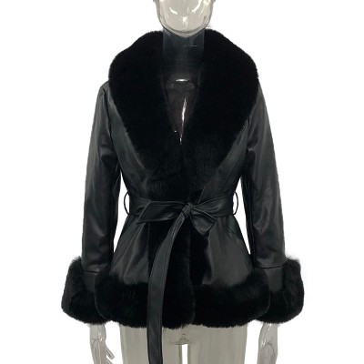 Elina PU Leather Short Jackets Women Tie Belt Waist Coats Women Elegant Side Pockets Faux Fur Jackets Female Ladies