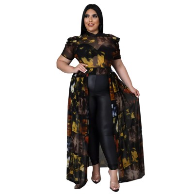 Wmstar Plus Size Plus Size T-Shirts Print Women Tops Puff Short Sleeve Mesh See Through Sexy Chiffon Bulk WholeDropshipping