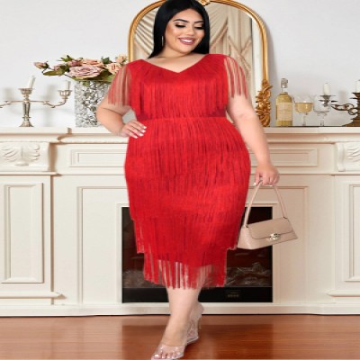 Plus Size Red Tassel Dress Women V Neck Sleeveless High Waist Fringe Cocktail Evening Birthday Party Gowns Outfits Summer